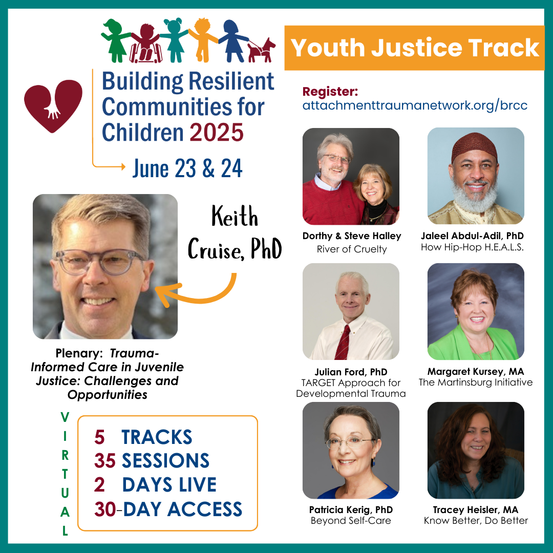 The Youth Justice track includes workshops for both those working in Juvenile Justice and those working in Child Welfare, because we know often the children we are served are impacted by both systems. In addition to the Plenary session and 6 workshops, there will be networking sessions, coffee chats with speakers and other 30-minute breakout offerings. CEs and college credit are available. Plus attendees will have 30 days to watch recordings of any sessions they missed, including professionals in the other tracks as well: Parenting/Caregiving, Education, Communities and Counselors/Therapists.